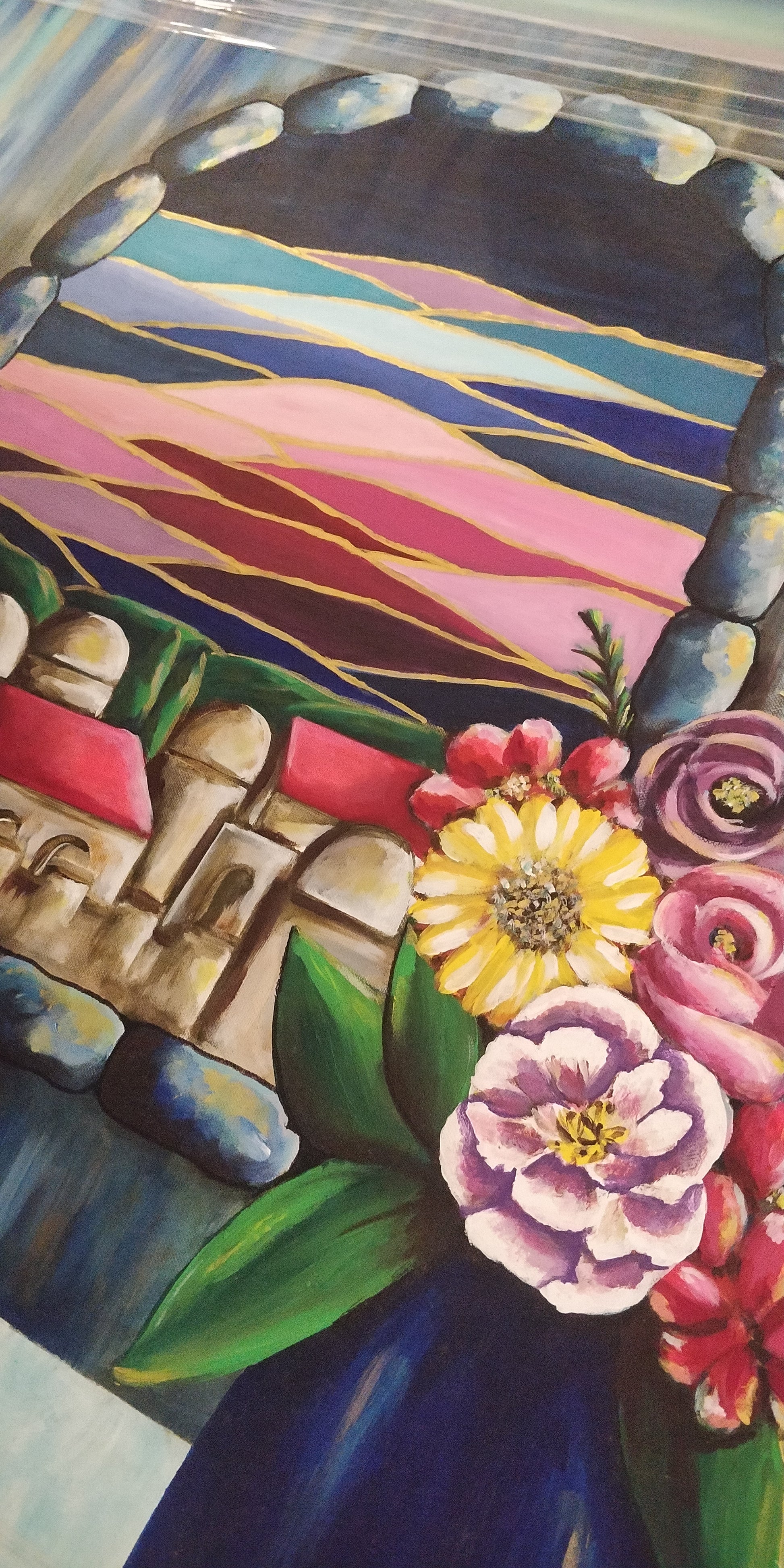 The tranquility of Shabbos in Israel expressed though an acrylic painting.